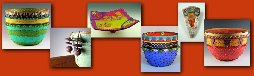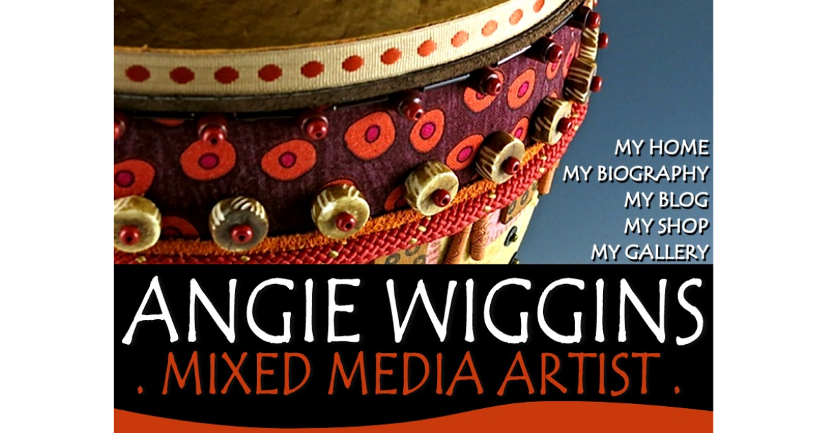 Having begun her artistic career as a weaver and fiber artist, Angie Wiggins has an insatiable interest in learning about all kinds of media in the art and fine craft world. After a decade of weaving, her interest turned to paper-making as well as felt-making. She took classes in both, but it was paper-making that won her over. Handmade paper bowls became the canvas onto which Angie embellishes all sorts of media: glass beads, leather, rubber, fabric, reeds, metal, paint, feathers, and wood, to list a few.